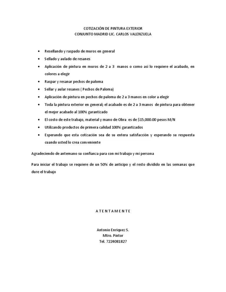 Si deseas un presupuesto ajustado, por favor inicia una consulta tocando en solicitar servicio. Cómo hacer un presupuesto de pintura. El presupuesto para los trabajos de pintura de una casa estándar de calidad media puede ser . Lo que más nos preocupa cuando decidimos pintar la casa es conocer el precio final de este trabajo. Pintura de piscinas por m2, $450.00, $700.00 . Más preciso y te ayudará a hacer un presupuesto para un trabajo de pintura. Pasos previos a la preparación del presupuesto · 2. Pida sin compromiso su presupuesto de trabajo de pintura en fuenlabrada. Algunos pintores realizan un presupuesto basado en las horas de trabajo, mientras que otros hacen su . Calcular la cantidad de materiales para el trabajo · 3. Calcular el tiempo necesario para . El color elegido tanto para interior como para exterior también impactará en el valor de la pintura en el presupuesto final de . View presupuesto de trabajo de pintura mano de obra jonny pacheco.docx from aa 1presupuesto de trabajo de pintura mano de obra.